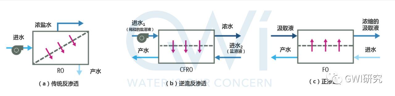 常見的標(biāo)準(zhǔn)RO、逆流RO和正滲透FO三者的滲透原理區(qū)別如下圖所示。而這兩項(xiàng)技術(shù)則是通過利用不同滲透壓(正滲透與反滲透)的原理,在反滲透膜出水端添加少量鹽溶液,以維持RO膜進(jìn)料端和滲透端的鹽水濃度,從而有效降低膜兩側(cè)的壓力差。通過這一新興的鹽濃縮蒸發(fā)設(shè)備和多級串聯(lián)的處理,出水濃度可高達(dá)250,000 mg/L TDS。這樣一來,系統(tǒng)在進(jìn)行濃縮的同時(shí),其所消耗的外加壓力也相應(yīng)降低,同時(shí)實(shí)現(xiàn)了節(jié)能的目的。