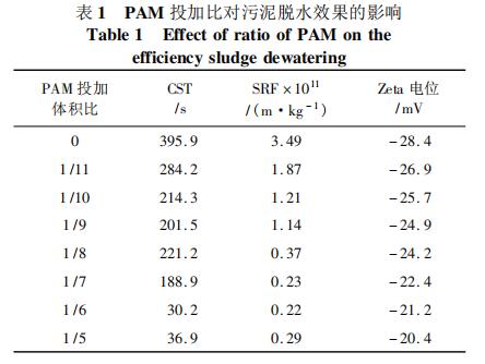 由表 1 可知,在投加 PAM 之前,CST 顯示為395. 9 s,SRF 為 3. 49 × 1011 m /kg( > 1. 0 × 1011 m /kg即為難脫水污泥),Zeta 電位為 - 28. 4 mV。由于污泥是由帶負電荷的顆粒組成。開始階段,隨著陽離子 PAM 投加比的增加,一方面由于 PAM 的絮凝作用;另一方面由于正電荷的引入,使得污泥間的靜電斥力不斷減小,更有利于絮體的形成,因此污泥的CST與 SRF下降較為明顯。當 PAM 體積投加比為 1 /6,滲濾液剩余污泥的 CST 和 SRF 達到最小值,分別為 30. 2 s、0. 22 × 1011 m /kg ( < 1. 0 × 1011m /kg),Zeta 電位為 - 21. 2 mV。當 PAM 體積投加比增大到 1 /5 時,污泥的 CST、SRF 出現回升,此時可能由于過量的 PAM 而增大活性污泥顆粒表面的粘度,從而不利于水分子的分離,使得污泥表面的自由水減少。在整個反應過程中由于陽離子 PAM投加體積比不斷增加,使得污泥顆粒表面引入的陽離子不斷增加,因此 Zeta 電位不斷增加,但是 Zeta電位的過分增大并不能使得污泥絮體更好的脫水。因此,從藥劑節省和脫水性能優化兩方面綜合考慮,確定 PAM 最佳投加比為 1 /6。
