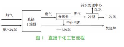 直接干化在能源上利用焚燒廠的余熱鍋爐煙氣 (175 ℃),但是在這個溫度下,煙氣的體積會很龐大,輸送管道占地較大。并且,175 ℃的煙氣未經凈化,煙氣中含氯、含塵較高,輸送條件不理想。在安全性上,焚燒廠的余熱鍋爐出口煙氣含氧量在 12%以下,可有效避免粉塵爆炸的情況;在環保性上,大量的煙氣帶來了尾氣處理的巨大壓力,并且煙氣的高溫也使得污泥在干燥時有更多的 VOCs 產生,廠區環境惡劣。